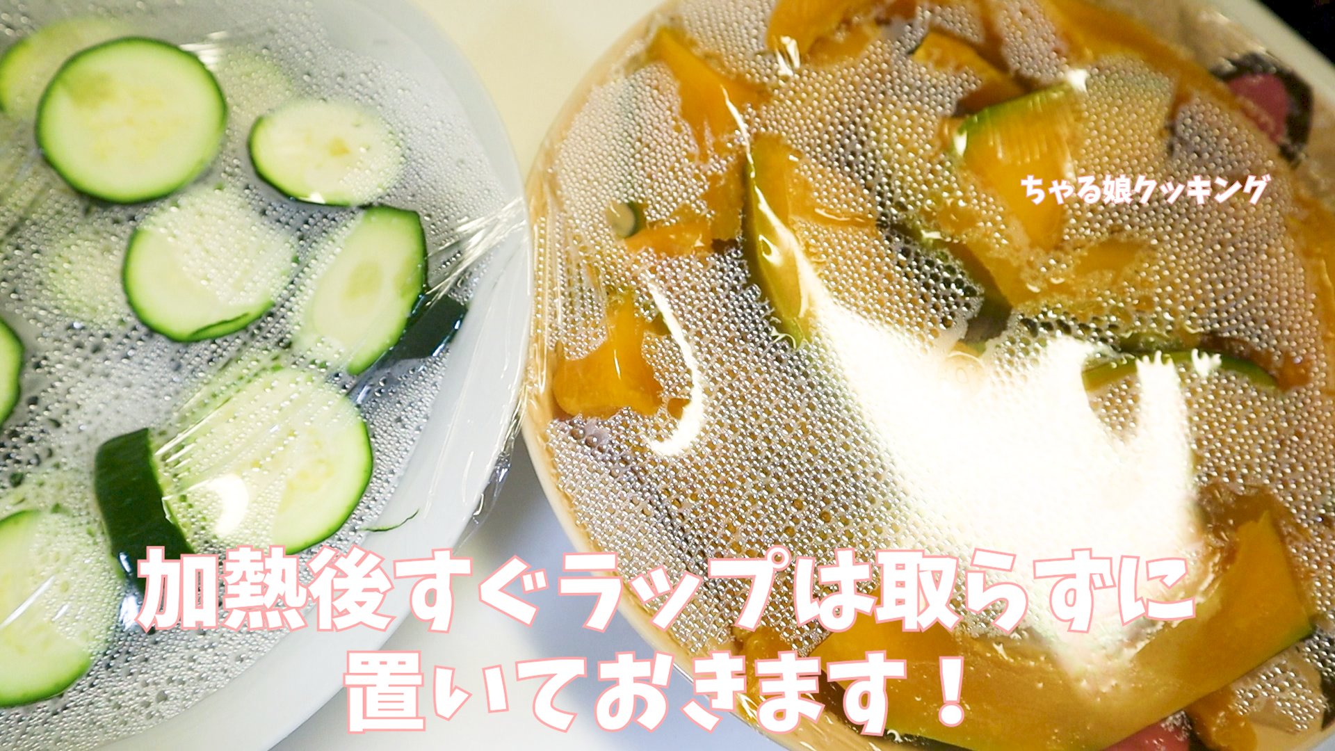 ズッキーニとかぼちゃは切って電子レンジへGO!するのですが、加熱後はラップしたまま放置することで乾燥が防げるそうです( ..)φ